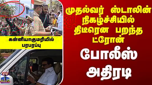 CM Stalin | Kanniyakumari | முதல்வர் ஸ்டாலின் நிகழ்ச்சியில் திடீரென பறந்த ட்ரோன்... போலீஸ் அதிரடி முதல்வர் நிகழ்ச்சி - அனுமதியின்றி டிரோன் பறக்கவிட்ட இளைஞரிடம் விசாரணை கன்னியாகுமரிக்கு சென்ற தமிழக முதல்வருக்கு நெல்லை திமுக சார்பில் பணகுடியில் நடந்த வரவேற்பு நிகழ்ச்சியில் அனுமதியின்றி டிரோன் பறக்கவிட்ட இளைஞரால் பரபரப்பு ஏற்பட்டது.... ட்ரோனை இயக்கிய கன்னியாகுமரியை சேர்ந்த குகன் என்பவரை பிடித்து ட்ரோனை கைப்பற்றிய போலீசார், அவரிடம் இது குறித்து விசாரணை நடத்தி வருகின்றனர். முதலமைச்சர் வருகையொட்டி நெல்லை பகுதியில் 2 நாட்கள் ட்ரோன் பறக்க மாவட்ட நிர்வாகம் சார்பில் தடை விதிக்கப்பட்டிருந்தது குறிப்பிடத்தக்கது.