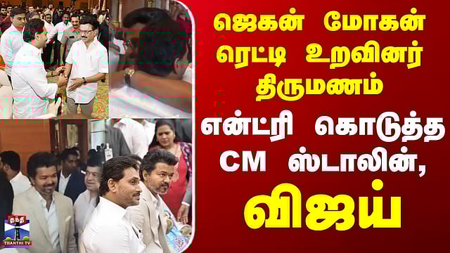 Jagan Mohan Reddy | CM Stalin | TVK Vijay | ஜெகன் மோகன் ரெட்டி உறவினர் திருமணம் - என்ட்ரி கொடுத்த CM ஸ்டாலின், விஜய் ஆந்திரப் பிரதேச முன்னாள் முதலமைச்சர் ஜெகன் மோகன் ரெட்டியின் உறவினரான ஒய்.எஸ். சுனில் ரெட்டியின் மகன் சாஹிலின் திருமண விழா சென்னையில் நடைபெற்றது... இவ்விழாவில் ஜெகன் மோகன் ரெட்டி கலந்து கொண்டு மணமக்களை வாழ்த்தினார். இந்த நிகழ்வில் முதலமைச்சர் ஸ்டாலின் கலந்து கொண்டு மணமக்களை வாழ்த்தினார்... மேலும், நடிகரும் தமிழக வெற்றிக்கழக தலைவருமான விஜய்யும் திருமண விழாவில் பங்கேற்றார்... அதேபோல் நடிகர்கள் சூர்யா மற்றும் கார்த்தி ஆகியோர் குடும்பத்துடன் திருமண விழாவுக்கு வருகை தந்த நிலையில், அவர்கள் ஜெகன் மோகன் ரெட்டியிடன் அன்பு பாராட்டினர். இந்த சந்திப்பு தொடர்பான வீடியோ காட்சிகள் சமூக வலைதளங்களில் வெளியாகி கவனம் பெற்றுள்ளன.