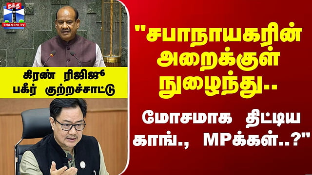 Om Birla | Kiren Rijiju | "சபாநாயகரை திட்டிய காங்., எம்பிக்கள்.." கிரண் ரிஜிஜூ குற்றச்சாட்டு #OmBirla #KirenRijiju #BJP #Congress மக்களவை சபாநாயகர் ஓம் பிர்லாவை, காங்கிரஸ் எம்பிக்கள் மோசமான வார்த்தைகளால் திட்டியதாக நாடாளுமன்ற விவகார துறை அமைச்சர் கிரண் ரிஜிஜூ குற்றம்சாட்டினார். 20 முதல் 25 காங்கிரஸ் எம்பிக்கள் சபாநாயகரின் அறைக்குள் நுழைந்து அவமதிக்கும் வகையில் பேசியதாகவும், தாமும் அப்போது அங்கு இருந்ததாகவும் அவர் தெரிவித்தார். சபாநாயகர் மென்மையானவர் என்பதால் கடுமையான நடவடிக்கை எடுக்கப்படவில்லை என்றும் கூறினார். பிரதமர் கூட சபாநாயகர் அனுமதியுடன் தான் பேசுவார் என்று கூறிய ரிஜிஜூ, எதிர்கட்சி எம்பிக்கள் குழந்தைகளை போல் நடந்துகொள்ள கூடாது என்றும் வலியுறுத்தினார்.