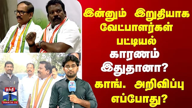 Congress | TN Election 2026 | இன்னும் இறுதியாக காங். வேட்பாளர்கள் பட்டியல் | காரணம் இதுதானா? | அறிவிப்பு எப்போது? #congress #Tnelection2026 #tnelection #congresscandidatelist #thanthitv காங்கிரஸ் வேட்பாளர்கள் பட்டியல் வெளியீடு எப்போது? திமுக கூட்டணியில் 28 இடங்கள் ஒதுக்கப்பட்ட காங்கிரஸ் கட்சியிலும் இன்னும் வேட்பாளர்கள் அறிவிக்கப்படவில்லை.. காங்கிரஸில் வேட்பாளர்களை அறிவிக்காததன் பின்னணியில் அக்கட்சி நிர்வாகிகளின் மாறுபட்ட கருத்து உள்ளதா?