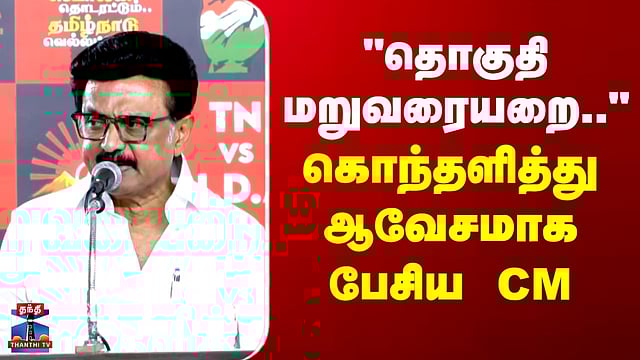 CM Stalin | "தொகுதி மறுவரையறை.." - கொந்தளித்து ஆவேசமாக பேசிய முதல்வர் #tnelection2026 #tamilnaduelection2026 #tnassemblyelection2026 #tamilnaduelection #tnelection #tnassemblyelection #assemblyelection #electioncommission #election2026 #electionswiththanthitv #thanthitv #therthalthiruvizha தமிழகத்தில் பெண்கள் இடஒதுக்கீடு பிரச்சனை அல்ல, தொகுதி மறுவரையறையே முக்கிய பிரச்சனையாக உள்ளது என்று முதலமைச்சர் ஸ்டாலின் தெரிவித்துள்ளார். சேலம் மாவட்டத்தில் உள்ள தொகுதிகளில் போட்டியிடும் திமுக மற்றும் கூட்டணி கட்சி வேட்பாளர்களுக்கு ஆதரவாக அவர் பிரசாரம் மேற்கொண்டார். அப்போது பேசிய அவர், 33 சதவீத பெண்கள் இடஒதுக்கீடு குறித்து இபிஎஸ்க்கு தெரியும் முன்பே அதனை நடைமுறைப்படுத்தியவர் முன்னாள் முதலமைச்சர் கருணாநிதி தான் என்று குறிப்பிட்டார். மேலும், சட்டமன்றம் மற்றும் நாடாளுமன்றத்தில் பெண்களுக்கு 33 சதவீத இடஒதுக்கீடு வழங்க வேண்டும் என்ற கோரிக்கைக்காக திமுக தொடர்ந்து போராடி வருவதாகவும் அவர் தெரிவித்தார்.