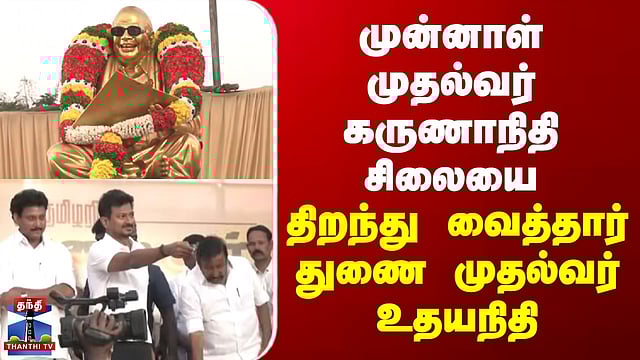 #DyCMUdhayanithi | #Karunanidhi | #Thanjavur | #Statue | #ThanthiTV DyCM Udhayanithi | முன்னாள் முதல்வர் கருணாநிதி சிலையை திறந்து வைத்தார் துணை முதல்வர் உதயநிதி ஸ்டாலின் தஞ்சை மாவட்டம் சானூரப்பட்டியில் முன்னாள் முதலமைச்சர் கருணாநிதியின் சிலையை துணை முதலமைச்சர் உதயநிதி ஸ்டாலின் திறந்து வைத்தார். பின்னர் பேசிய அவர், கருணாநிதி ஒரு வரலாற்றுப் பதிவு, அவரது சாதனைகளை யாராலும் முறியடிக்க முடியாது என்றார். மேலும், பெண்களுக்கு சொத்தில் சம உரிமை வழங்கி, பெண்களுக்காக பல திட்டங்களை கொண்டு வந்தவர் கருணாநிதி என புகழாரம் சூட்டினார்.