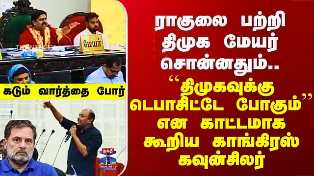 திருப்பூர் மாநகராட்சி கூட்டத்தில் சொத்து வரி உயர்வு மற்றும் குப்பை விவகாரம் தொடர்பாக திமுக மேயருக்கும், காங்கிரஸ் கவுன்சிலருக்கும் இடையே வாக்குவாதம் ஏற்பட்டது. 'பழையதை பேசி ராகுல் காந்தி அடையாளத்தை இழக்கப்போகிறார்' என மேயர் தினேஷ் குமார் விமர்சித்ததால் பரபரப்பு ஏற்பட்டது. அதற்கு பதிலடி கொடுத்த காங்கிரஸ் கவுன்சிலர் செந்தில்குமார், 'திமுக தனித்து நின்றால் டெபாசிட் போய்விடும், ஜெயலலிதா இருந்தபோது பல இடங்களில் திமுக டெபாசிட் இழந்ததை மறக்க வேண்டாம்' என ஆவேசமாக பேசினார். இரு தரப்பினரிடையே ஏற்பட்ட இந்த வார்த்தைப் போரால் மாமன்ற கூட்டத்தில் பெரும் பரபரப்பு நிலவியது.