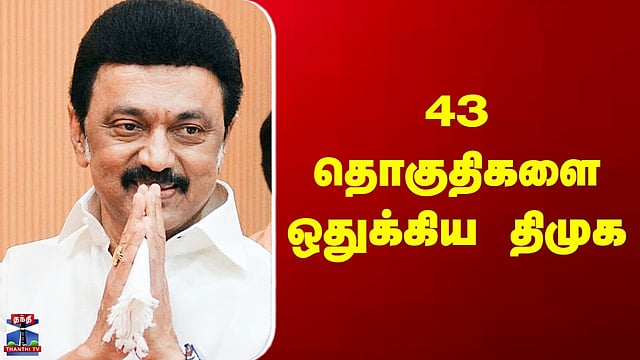திமுக கூட்டணியில் 6 கட்சிகளுக்கு தொகுதி பங்கீடு நிறைவு திமுக கூட்டணியில் இதுவரை 43 தொகுதிகள் கூட்டணி கட்சிகளுக்கு ஒதுக்கீடு செய்யப்பட்டுள்ளன. அதன்படி காங்கிரஸ் கட்சிக்கு 28 தொகுதிகளும், இந்திய கம்யூனிஸ்ட் கட்சிக்கு 5 தொகுதிகளும், மதிமுகவிற்கு 4 தொகுதிகளும், இந்திய யூனியன் முஸ்லீம் லீக், மனிதநேய மக்கள் கட்சி, கொங்குநாடு மக்கள் தேசிய கட்சிகளுக்கு தலா 2 தொகுதிகளும் ஓதுக்கீடு செய்யப்பட்டுள்ளன.