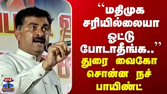 "ஓட்டு யாருக்கு வேண்டுமானாலும் போட்டுக்கோங்க..." "மதிமுக சரியில்லை என்றால் ஓட்டு போடாதீங்க..." தென்காசி மாவட்டம் கலிங்கப்பட்டியில் நடந்த பொதுமக்கள் சந்திப்பு கூட்டத்தில் பேசிய மதிமுக எம்.பி., துரை வைகோ, அரசியலில் நல்ல மனிதர்களை தேர்வு செய்ய வேண்டும் என்றும், மதிமுக சரியில்லை என்றால், அவர்களுக்கு ஓட்டு போடாதீர்கள் என்றும் பேசினார்
