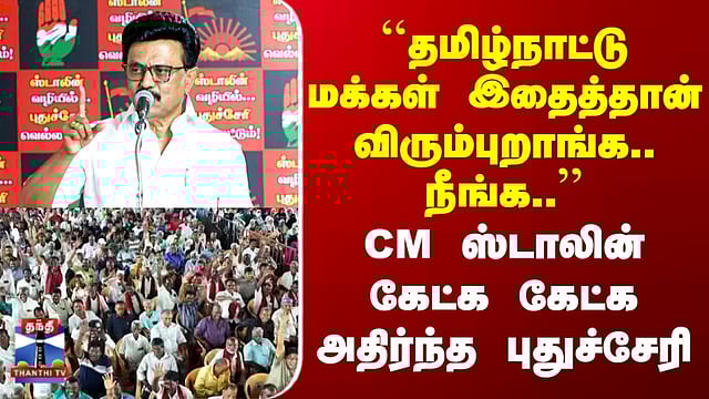 CM Stalin | Puducherry | Election 2026 | ``தமிழ்நாட்டு மக்கள் இதைத்தான் விரும்புறாங்க..நீங்க..'' | CM ஸ்டாலின் கேட்க கேட்க அதிர்ந்த புதுச்சேரி #CMStalin #puducherry #Election2026 #puducherryelection2026 #thanthitv #therthalthiruvizha #electionswiththanthitv "என்.டி.ஏ கூட்டணி ஆட்சியில் புதுச்சேரி மாநிலம் மோசமான நிலையில் உள்ளது" புதுச்சேரியில் வியாழக்கிழமை தேர்தல் - தமிழக முதல்வர் ஸ்டாலின் பிரசாரம் மதச்சார்பற்ற முற்போக்கு கூட்டணி வேட்பாளர்களை ஆதரித்து வாக்குசேகரிப்பு