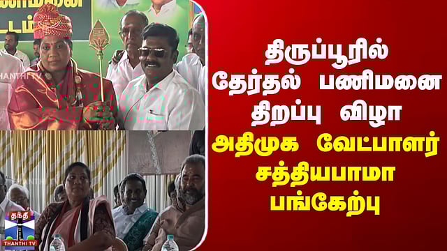 Tirupur | ADMK | TN Election | திருப்பூரில் தேர்தல் பணிமனை திறப்பு விழா - அதிமுக வேட்பாளர் சத்தியபாமா பங்கேற்பு #tirupur #admk #tnelection2026 #electioncommission #tnelection #election2026 #electionswiththanthitv #thanthitv #therthalthiruvizha தேர்தல் பணிமனை திறப்பு விழா - அதிமுக வேட்பாளர் சத்தியபாமா பங்கேற்பு திருப்பூர் மாவட்டம் தாராபுரம் சட்டமன்றத் தொகுதி அதிமுக வேட்பாளர் சத்தியபாமா, குண்டடம் பேருந்து நிலையம் அருகே அதிமுக தேர்தல் பணிமனை திறப்பு விழாவில் சிறப்பு விருந்தினராகக் கலந்து கொண்டார். திருப்பூர் புறநகர் அதிமுக கிழக்கு மாவட்டச் செயலாளரும், மடத்துக்குளம் எம்.எல்.ஏவுமான மகேந்திரன் தலைமையில் நடைபெற்ற அதிமுக தேர்தல் பணிமனை திறப்பு, வேட்பாளர் அறிமுக விழாவிற்கு, மாநில அம்மா பேரவை இணைச் செயலாளர் முத்து வெங்கடேஸ்வரன ஏற்பாடுகளைச் செய்திருந்தார். குண்டடம் மேற்கு மற்றும் கிழக்கு ஒன்றியச் செயலாளர்களான செந்தில்குமார், சோமசுந்தரம் ஆகியோர் முன்னிலையில் தொண்டர்கள் பங்கேற்றனர்... கூட்டத்தில் பேசிய வேட்பாளர் சத்தியபாமா, "என்னை வெற்றி பெறச் செய்து சட்டமன்றத்திற்கு அனுப்பினால், தொகுதிப் பிரச்சினைகளுக்காக முன்னின்று குரல் கொடுத்து அனைத்தையும் சரி செய்வேன்" என உறுதி அளித்தார்.