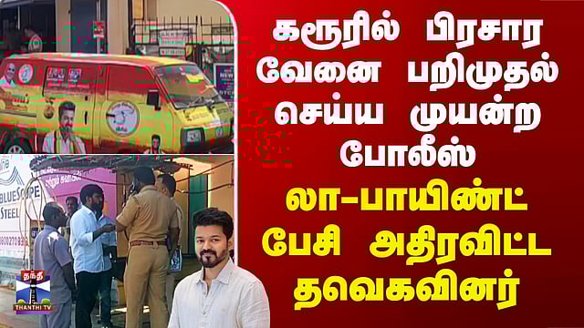 #tvk #vijay தவெக பிரசார வாகனத்தை போலீஸ் பறிமுதல் செய்ய முயன்றதால் பரபரப்பு கரூரில் தமிழக வெற்றிக் கழகத்தின் தேர்தல் பரப்புரை வாகனத்தில் விளம்பர ஸ்டிக்கர்கள் ஒட்டப்பட்டபோது, காவல்துறையினர் வாகனத்தை பறிமுதல் செய்ய முயன்றதால் பரபரப்பு ஏற்பட்டது. பறிமுதல் செய்ய வந்த காவலர்களிடம், அனுமதி பெறாமல் சாலையில் சென்றால் மட்டும் தான் பறிமுதல் செய்ய முடியும் என அக்கட்சியின் வழக்கறிஞர்கள் வாக்குவாதத்தில் ஈடுபட்டனர். பிறகு தேர்தல் பறக்கும் படை அதிகாரிகள் தலையிட்டு விசாரணை நடத்தினர். இறுதியில், அதிகாரிகள் வேலை முடிந்தவுடன் ஸ்டிக்கரை முழுவதுமாக மறைத்துவிட்டு, சாலையில் எடுத்து செல்ல வேண்டும் என அறிவுறுத்தினர். இதன் பிறகு ஸ்டிக்கர் ஒட்டப்பட்ட வாகனம் முழுவதும், தார்பாய் கொண்டு மறைத்து எடுத்து செல்லப்பட்டது.