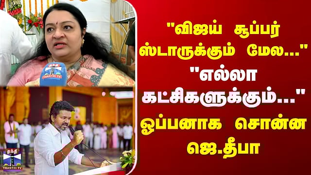 J Deepa | TVK Vijay | ADMK | "விஜய் சூப்பர் ஸ்டாருக்கும் மேல..." - ஓப்பனாக சொன்ன ஜெ.தீபா எல்லா கட்சியின் வாக்குகளையும் விஜய் பிரிப்பார் - ஜெ.தீபா தவெக தலைவர் விஜய்யின் வருகை வரவேற்கத்தக்கது என்றும், அவர் அனைத்து கட்சிகளின் வாக்குகளையும் பிரிப்பார் என்றும் ஜெயலலிதாவின் அண்ணன் மகள் ஜெ.தீபா கருத்து தெரிவித்துள்ளார். முன்னாள் முதல்வர் ஜெயலலிதாவின் பிறந்த நாளை முன்னிட்டு போயஸ் கார்டனில் அவரது உருவப்படத்திற்கு ஜெ.தீபா மாரியாதை செலுத்தினார். தொடர்ந்து பேட்டி அளித்த அவர், தேர்தலுக்கு பிறகு அதிமுக இருந்தால் சந்தோஷம் என்றும், என்டிஏ கூட்டணிக்கு வெற்றி வாய்ப்பு இல்லை என்றும் விமர்சித்தார்.