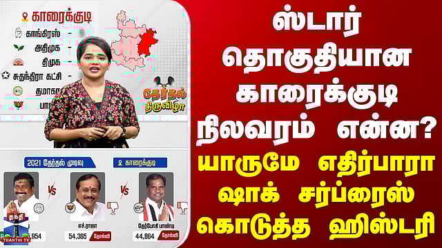 #karaikudi | #tnelection2026 | #election2026 ஸ்டார் தொகுதியான காரைக்குடி நிலவரம் என்ன? யாருமே எதிர்பாரா ஷாக் சர்ப்ரைஸ் கொடுத்த ஹிஸ்டரி கட்டிடக்கலை, சமையற்கலைக்கு பெயர்போன ஊரு. விவசாயமும், நெசவுத்தொழிலும் மக்களோட பிரதான தொழிலா இருக்கு. பல செட்டிநாடு பங்களாக்களை கொண்ட தொகுதியில சுற்றுலாவும் முக்கியமானதா இருக்கு. பிப்ரவரி 23-ல தேர்தல் ஆணையம் வெளியிட்ட இறுதி வாக்காளர் பட்டியல்ல ஒரு லட்சத்து 48 ஆயிரத்து 87 ஆண் வாக்காளர்கள், ஒரு லட்சத்து 55 ஆயிரத்து 256 பெண் வாக்காளர்கள், 28 மூன்றாம் பாலின வாக்காளர்கள் என மொத்தமாக 3 லட்சத்து 3 ஆயிரத்து 371 வாக்காளர்கள் இருப்பதாக தெரிவிக்கப்பட்டிருந்தது.