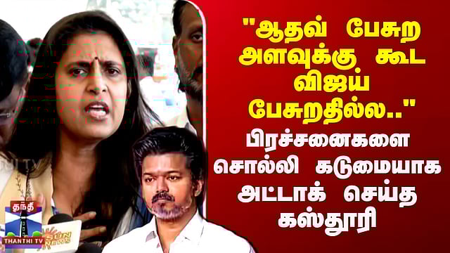 "ஆதவ் பேசுற அளவுக்கு கூட விஜய் பேசுறதில்ல.." - பிரச்சனைகளை சொல்லி சொல்லி கடுமையாக அட்டாக் செய்த கஸ்தூரி விஜய், தமிழக அரசை கடுமையாக விமர்சித்த நடிகை கஸ்தூரி கோவை விமான நிலையத்தில் செய்தியாளர்களை சந்தித்த பாஜகவைச் சேர்ந்த நடிகை கஸ்தூரி, தமிழகத்தில் சட்டம் ஒழுங்கு, பெண்கள் பாதுகாப்பு ஆகியவை சீர்கெட்டுள்ளதாகவும், அதற்கு தவெக தலைவர் விஜய் இதுவரை குரல் கொடுக்கவேவில்லை எனவும் குற்றம்சாட்டினார்.