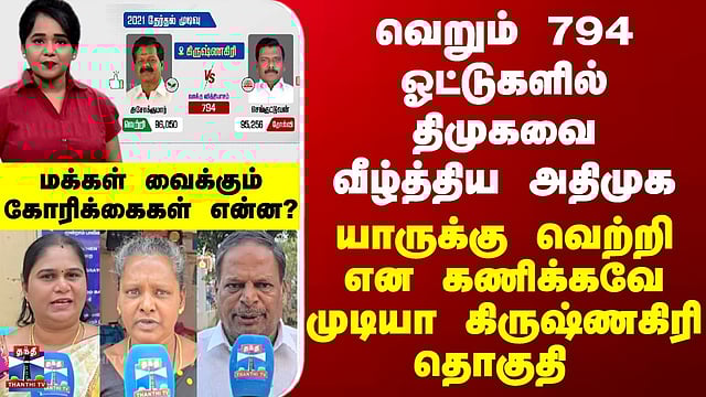 வெறும் 794 ஓட்டுகளில் திமுகவை வீழ்த்திய அதிமுக... யாருக்கு வெற்றி என கணிக்கவே முடியா கிருஷ்ணகிரி தொகுதி கிருஷ்ணகிரி நகர்பகுதிகளையும், காவேரிப்பட்டணத்தையும் உள்ளடக்கிய தொகுதி. மா, மல்லி, நெல் சாகுபடினு விவசாயமே தொகுதி மக்களுடைய பிரதான தொழிலா இருக்கு. காவேரிப்பட்டணம் பகுதியில நிப்பட்... பால்கோவா தயாரிப்பு, தீப்பெட்டி தயாரிப்புனு சிறு குறு தொழில்கள் மக்களோட முக்கிய வேலைவாய்ப்பா இருக்கு. தேர்தல் ஆணையம் பிப்ரவரி 23-ல வெளியிட்ட இறுதி வாக்காளர் பட்டியல்ல, தொகுதியில ஒரு லட்சத்து 29 ஆயிரத்து 777 ஆண் வாக்காளர்கள், ஒரு லட்சத்து 35 ஆயிரத்து 200 பெண் வாக்காளர்கள் 60 மூன்றாம் பாலின வாக்காளர்கள் என மொத்தமாக 2 லட்சத்து 65 ஆயிரத்து 37 வாக்காளர்கள் இருப்பதா தெரிவித்திருந்தது.