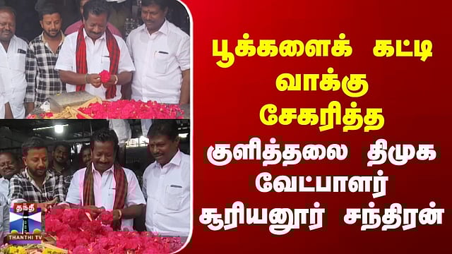 Kulithalai | DMK | TN Election 2026 | பூக்களைக் கட்டி வாக்கு சேகரித்த குளித்தலை திமுக வேட்பாளர் சூரியனூர் சந்திரன் #kulithalai #DMK #tnelection2026 #karur #thanthitv பூக்களைக் கட்டி வாக்கு சேகரித்த குளித்தலை திமுக வேட்பாளர் குளித்தலை சட்டமன்றத் தொகுதி திமுக வேட்பாளர் சூரியனூர் சந்திரன், சுங்ககேட் ரவுண்டானா பகுதிகளில் உள்ள வணிக வளாகங்கள் மற்றும் கடைகளில் உதயசூரியன் சின்னத்திற்குத் தீவிர வாக்கு சேகரிப்பில் ஈடுபட்டார். பிரசாரத்தின் போது திடீரென ஒரு பூக்கடைக்குள் சென்ற சூரியனூர் சந்திரன், அங்கிருந்த தொழிலாளர்களுடன் அமர்ந்து ரோஜாப்பூ மாலை கட்டி ஆதரவு திரட்டினார். தொடர்ந்து அங்கிருந்த இளம் பெண் வாக்காளர்களைச் சந்தித்த அவர், "புதுமைப் பெண் திட்டத்தின் கீழ் வழங்கப்படும் தொகை 1,500 ரூபாயாக உயர்த்தப்படும்" என்ற தேர்தல் வாக்குறுதியை எடுத்துக் கூறினார். வேட்பாளரின் எதார்த்தமான அணுகுமுறையைக் கண்டு உற்சாகமடைந்த இளம்பெண்கள், தங்களது பெற்றோருடன் நின்று அவருடன் ஆர்வமாகச் செல்பி எடுத்துக் கொண்டனர்.
