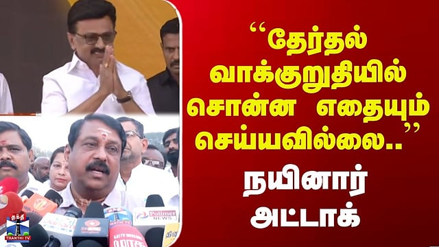 Nainar Nagendran | "தேர்தல் வாக்குறுதியில் சொன்ன எதையும் செய்யவில்லை.." | நயினார் அட்டாக் தேர்தல் வாக்குறுதிகளை திமுக அரசு நிறைவேற்றவில்லை-நயினார் கடந்த 5 ஆண்டு காலத்தில் அளித்த தேர்தல் வாக்குறுதிகளை திமுக அரசு நிறைவேற்றவில்லை என, தமிழக பா.ஜ.க தலைவர் நயினார் நாகேந்திரன் தெரிவித்தார்.