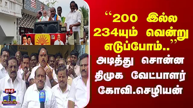 Thanjavur | DMK | ``200 இல்ல 234யும் வென்று எடுப்போம்..'' | அடித்து சொன்ன திருவிடைமருதூர் தொகுதி திமுக வேட்பாளர் கோவி.செழியன் #thanjavur #DMK #Kovichezhiyan #TNElection2026 #thanthitv "முதல்வர் ஸ்டாலின் மக்கள் பேராதரவோடு மீண்டும் ஆட்சி அமைப்பார்" திருவிடைமருதூரில் அரசு கலை அறிவியல் கல்லூரி , சமூகநீதி விடுதி மற்றும் கும்பகோணத்தில் பல்கலைக்கழகம் என, கல்விப் புரட்சிக்கு வித்திட்ட தமிழக முதல்வர் மு.க.ஸ்டாலின் மக்களின் பேராதரவோடு மீண்டும் ஆட்சி அமைப்பார் என கோவி.செழியன் கூறியுள்ளார். தஞ்சை திருவிடைமருதூர் தொகுதி திமுக வேட்பாளர் கோவி.செழியன் தீவிர வாக்கு சேகரிப்பில் ஈடுபட்டுள்ளார். வில்லியவரம்பல், அய்யாவாடி உள்ளிட்ட 30-க்கும் மேற்பட்ட கிராமங்களில் கொளுத்தும் வெயிலையும் பொருட்படுத்தாமல் அவர் சூறாவளிப் பிரச்சாரம் மேற்கொண்டார். வழிநெடுகிலும் தொண்டர்கள் இருசக்கர வாகனப் பேரணி நடத்தி உற்சாக வரவேற்பு அளித்தனர். பின்னர் கோவி.செழியன் செய்தியாளர்களை சந்தித்தார்.