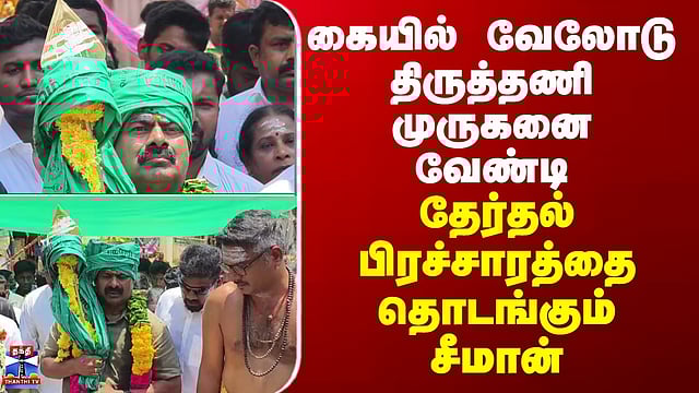 நாம் தமிழர் கட்சி ஒருங்கிணைப்பாளர் சீமான் திருத்தணி முருகன் மலை அடிவாரத்தில் உள்ள சரவண பொய்கை திருக்கோளத்தில் இருந்து 365 படிகள் வழியாக பூஜை செய்யப்பட்ட வேல் எடுத்துக்கொண்டு 365 திருப்படி வழியாக நடந்தபடி வேட்பாளருடன் மலைக் கோவிலுக்கு சாமி தரிசனம் செய்ய வந்து கொண்டிருக்கிறார்