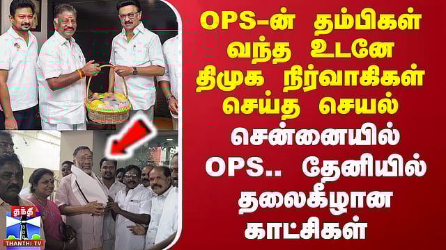 OPS-ன் தம்பிகள் வந்த உடனே திமுக நிர்வாகிகள் செய்த செயல்.. சென்னையில் OPS.. தேனியில் தலைகீழான காட்சிகள் ஓ. பன்னீர்செல்வம் திமுகவில் இணைந்த நிகழ்வை கொண்டாடுவிதமாக ஓபிஎஸ் ஆதரவாளர்கள் பெரியகுளத்தில் வெடி வெடித்து இனிப்பு வழங்கி கொண்டாட்டம். ஓபிஎஸ் சகோதரர்கள் ஓ ராஜா மற்றும் சண்முகசுந்தரம் இருவருக்கும் திமுக நிர்வாகிகள் சால்வை அணிவித்து வரவேற்றனர்.