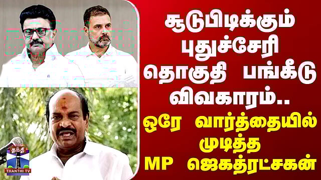 புதுச்சேரி திமுக தேர்தல் பொறுப்பாளர் ஜெகத்ரட்சகன் எம்.பி பேட்டி புதுச்சேரியில் திமுக, காங்கிரஸ் இடையே தொகுதி பங்கீட்டு பேச்சுவார்த்தை சுமுகமாக நடந்து வருவதாக புதுச்சேரி திமுக தேர்தல் பொறுப்பாளர் ஜெகத்ரட்சகன் எம்.பி கூறியுள்ளார். அவர் அளித்த பேட்டியை காண்போம்.