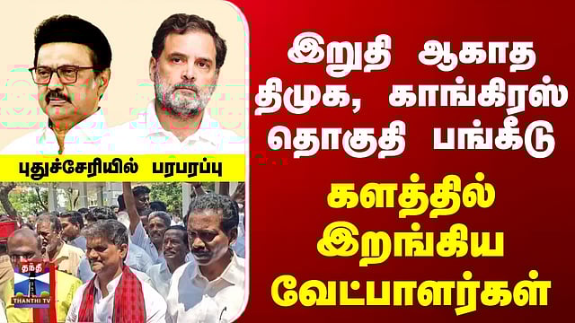 இறுதி ஆகாத தொகுதி பங்கீடு - புதுச்சேரியில் திமுக, காங்கிரஸ் வேட்புமனு தாக்கல் புதுச்சேரியில் தொகுதி பங்கீடு இறுதியாகாத நிலையில் திமுக, காங்கிரஸ் வேட்பாளர்கள் வேட்புமனு தாக்கல் செய்து வருகின்றனர்.