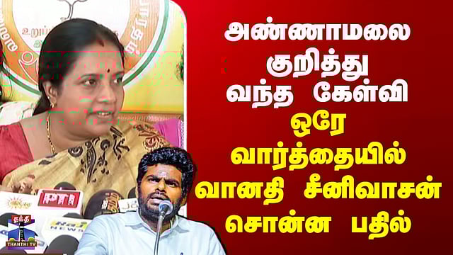அண்ணாமலை குறித்து வந்த கேள்வி - ஒரே வார்த்தையில் வானதி சீனிவாசன் சொன்ன பதில் #kovai #vanathisrinivasan #bjp #nda #annamalai #thanthitv கோவை வடக்கு தொகுதியில் யாருக்கு சீட் வழங்கினாலும் வெற்றிக்காக உழைப்போம் என, வானதி சீனிவாசன் தெரிவித்துள்ளார். கோவை காந்திபுரம் VKK சாலையிலுள்ள பாஜக அலுவலகத்தில், தேசிய மகளிர் அணி தலைவரும், கோவை தெற்கு தொகுதி எம்எல்ஏவுமான வானதி சீனிவாசன் செய்தியாளர்களை சந்தித்தார். தொடர்ந்து பேசிய அவர், தேர்தலில் போட்டியிடவில்லை என அண்ணாமலை கடிதம் எழுதிய விவகாரம் தனக்கு தெரியாது என கூறினார். மேலும் இன்னும் 3 நாட்களில் பாஜக வேட்பாளர் பட்டியலை, பாஜக தலைமை அறிவிக்கும் எனவும் தெரிவித்தார்.