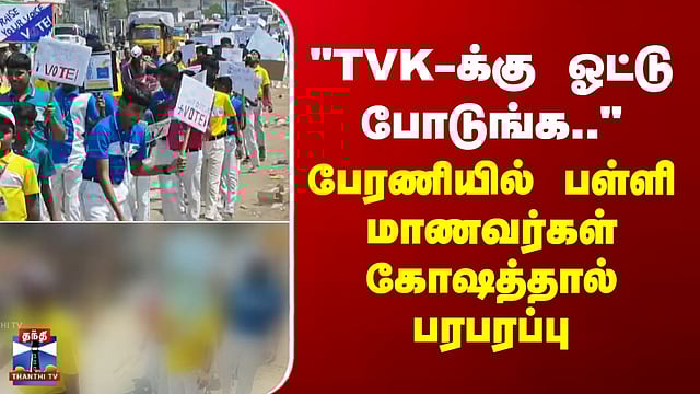 Kanchipuram | "TVK-க்கு ஓட்டு போடுங்க.." - பேரணியில் பள்ளி மாணவர்கள் கோஷத்தால் பரபரப்பு #election2026 #Awareness #Kanchipuram #thanthitv தேர்தல் விழிப்புணர்வு பேரணி - பள்ளி மாணவர்கள் கோஷத்தால் பரபரப்பு காஞ்சிபுரம் மாவட்டம் மாங்காட்டில், வாக்களிப்பதன் அவசியம் குறித்து தேர்தல் விழிப்புணர்வு பேரணி நடைபெற்றது. நகராட்சி நிர்வாகம் சார்பில் ஏற்பாடு செய்யப்பட்ட இந்த நிகழ்வில், 100 சதவீதம் வாக்களிப்பு குறித்து பள்ளி மாணவர்கள் விழிப்புணர்வு ஏற்படுத்தினர். பதாகைகள் ஏந்தி மாணவர்கள் ஊர்வலமாக சென்ற நிலையில், சிலர் திடீரென தவெக கட்சிக்கு வாக்களிக்க வேண்டும் என கோஷம் எழுப்பியதால் பரபரப்பு ஏற்பட்டது.