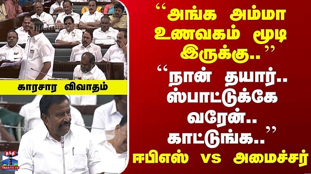 ADMK vs DMK | "``அங்க அம்மா உணவகம் மூடி இருக்கு..'' | "நான் தயார்.. ஸ்பாட்டுக்கே வரேன்..காட்டுங்க.." #EPS #ADMK #DMK #ammaunavagam #tnassembly #thanthitv அம்மா உணவகம் - பேரவையில் திமுக-அதிமுக காரசார விவாதம் பட்டினப்பாக்கத்தில் அம்மா உணவகம் மூடப்பட்டது ஏன்? - எதிர்க்கட்சித் தலைவர் ஈபிஎஸ் அதிமுக ஆட்சியைவிட திமுக ஆட்சியில் அம்மா உணவகம் நல்ல நிலையில் உள்ளது - அமைச்சர் கே.என்.நேரு அம்மா உணவகம் தொடர்பாக பேரவையில் திமுக - அதிமுக காரசார விவாதம்