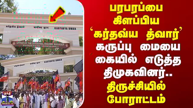 #Trichy | #DMKProtest | #KartavyaDwar | #ThanthiTV Trichy | DMK Protest | பரபரப்பை கிளப்பிய `கர்தவ்ய த்வார்' - கருப்பு மையை கையில் எடுத்த திமுகவினர்.. திருச்சியில் போராட்டம் திருச்சி ரயில்வே கோட்ட மேலாளர் அலுவலகத்தில் இந்தி பெயர் பலகை வைக்கப்பட்டதற்கு எதிர்ப்பு தெரிவித்து திமுகவினர் முற்றுகை போராட்டத்தில் ஈடுபட்டனர். அலுவலக நுழைவுவாயிலில் கர்தவ்ய த்வார் என்ற இந்தி வார்த்தை தமிழ் எழுத்துக்களுடன் இடம்பெற்றதை கண்டித்து திமுகவினர் போராட்டம் நடத்தினர். அப்போது கல்வெட்டில் இருந்த இந்தி எழுத்துகளை கருப்பு மை கொண்டு அழித்து எதிர்ப்பு தெரிவித்தனர். அனைவருக்கும் புரியும் வகையில் பெயர் பலகை வைக்க வேண்டும் என்றும் இல்லையெனில் தொடர் போராட்டம் நடத்தப்படும் என்றும் திமுகவினர் எச்சரித்தனர்.
