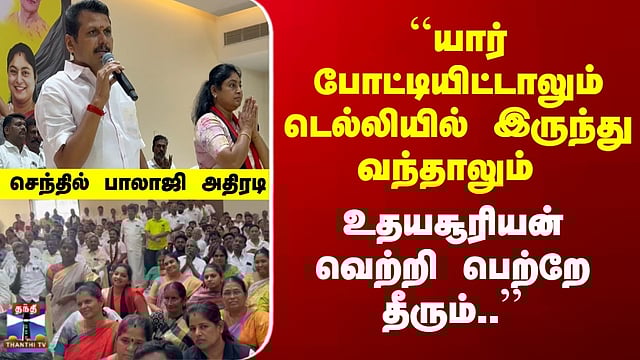 Kovai | DMK | ``உதயசூரியன் வெற்றி பெற்றே தீரும்..'' | செந்தில் பாலாஜி அதிரடி #coimbatore #DMK #senthilbalaji #TNelection #thanthitv கோவையில் அனைத்து தொகுதிகளிலும் திமுக வெற்றி பெறும் - செந்தில் பாலாஜி சட்டமன்றத் தேர்தலில் கோவை மாவட்டத்தில் அனைத்து தொகுதிகளிலும் திமுக வெற்றி பெறும் என்று செயல் வீரர்கள் கூட்டத்தில் முன்னாள் அமைச்சர் செந்தில் பாலாஜி தெரிவித்துள்ளார். மேட்டுப்பாளையத்தில் உள்ள ஒரு தனியார் திருமண மண்டத்தில் திமுக செயல் வீரர்கள் கூட்டம் நடைபெற்றது. இதில் பங்கேற்று பேசிய அவர், திமுக வேட்பாளர் கவிதா கல்யாண சுந்தரத்தை ஐம்பதாயிரம் வாக்குகள் வித்தியாசத்தில் வெற்றி பெற வைக்க திமுகவினர் முழுவீச்சில் பணியாற்ற வேண்டும் என்று கூறினார். இந்த கூட்டத்தில், மேட்டுப்பாளையம் காரமடை, சிறுமுகை உள்ளிட்ட பகுதிகளை சேர்ந்த முக்கிய பொறுப்பாளர்கள் மற்றும் தொண்டர்கள் கலந்து கொண்டனர்.