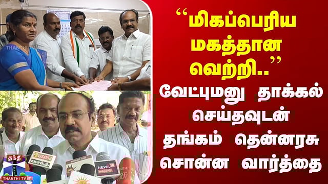 Virudhunagar | DMK | Thangam Thennarasu | ``மிகப்பெரிய மகத்தான வெற்றி..'' | வேட்புமனு தாக்கல் செய்தவுடன் தங்கம் தென்னரசு சொன்ன வார்த்தை #virudhunagar #DMK #thangamthennarasu #tnelection2026 #thanthitv திருச்சுழி திமுக வேட்பாளர் தங்கம் தென்னரசு வேட்புமனு தாக்கல் விருதுநகர் மாவட்டம், திருச்சுழி சட்டமன்றத் தொகுதியில் திமுக சார்பில் ஏழாவது முறையாகப் போட்டியிட, தமிழக நிதியமைச்சர் தங்கம் தென்னரசு இன்று தனது வேட்புமனுவைத் தாக்கல் செய்தார். திருச்சுழி வட்டாட்சியர் அலுவலகத்திற்கு வருகை தந்த அவர், தேர்தல் நடத்தும் அலுவலர் சாந்தியிடம் மனுவை அளித்து முறைப்படி உறுதிமொழி ஏற்றுக் கொண்டார். முன்னதாக, அமைச்சருக்கு திமுக நிர்வாகிகள் மற்றும் தொண்டர்கள் உற்சாக வரவேற்பு அளித்தனர். வேட்புமனுத் தாக்கலுக்குப் பிறகு செய்தியாளர்களைச் சந்தித்த அமைச்சர் தங்கம் தென்னரசு, திமுக கூட்டணி கட்சிகளின் பேராதரவோடு மீண்டும் ஒரு மகத்தான வெற்றியைப் பெறும் என்றும், தமிழகம் முழுவதும் திமுக கூட்டணிக்கு வெற்றி வாய்ப்பு மிகவும் பிரகாசமாக உள்ளது எனவும் குறிப்பிட்டுள்ளார்.