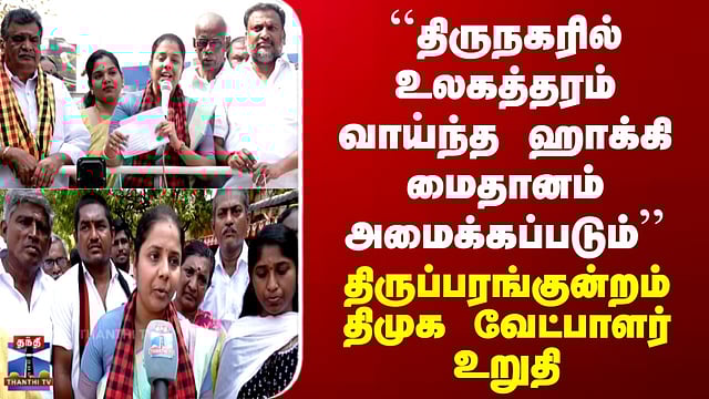 "திருநகரில் உலகத்தரம் வாய்ந்த ஹாக்கி மைதானம் அமைக்கப்படும்" மதுரை திருப்பரங்குன்றம் சட்டமன்றத் தொகுதி திமுக வேட்பாளர் கிருத்திகா தங்கபாண்டி, திருநகர் 3-வது பேருந்து நிறுத்தம், மகாலட்சுமி காலனி மற்றும் சொர்ணம் காலனி ஆகிய பகுதிகளில் உதயசூரியன் சின்னத்திற்கு ஆதரவாகத் தீவிர வாக்கு சேகரிப்பில் ஈடுபட்டார். வழிநெடுகிலும் பொதுமக்கள் அவருக்கு உற்சாக வரவேற்பு அளித்தனர். பிரச்சாரத்தின் போது கிருத்திகா தங்கபாண்டி பேசியபோது, திருநகர் பகுதியில் உலகத்தரம் வாய்ந்த சிந்தடிக் ஹாக்கி மைதானம் கட்டித் தரப்படும் எனவும், பயன்பாட்டிற்கு வந்துள்ள அண்ணா அறிவியல் பூங்காவில் நவீன ஆய்வக கருவிகள் அமைக்கப்படும் என்றும் உறுதியளித்தார்.