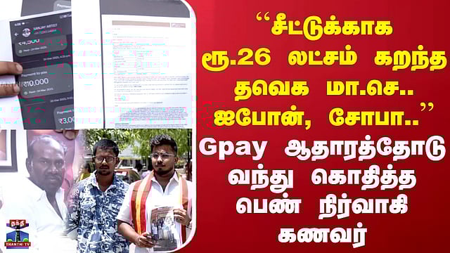 ``சீட்டுக்காக ரூ.26 லட்சம் கறந்த தவெக மா.செ.. ஐபோன், சோபா..’’ Gpay ஆதாரத்தோடு வந்து கொதித்த பெண் நிர்வாகி கணவர் #TVK | #vijay #GPayTransaction #Madurai #thanthitv தவெக மதுரை தெற்கு மாவட்ட செயலாளர் மீது பண மோசடி புகார் தமிழக வெற்றிக் கழகத்தின் மதுரை தெற்கு மாவட்ட செயலாளர் எஸ்.ஆர்.தங்கப்பாண்டி மீது, தவெக பெண் நிர்வாகியின் கணவர் பாலாஜி காவல்துறையில் பணமோசடி புகார் அளித்துள்ளார். கட்சியில் பதவி பெற்றுத் தருவதாகவும், தொழில் முதலீடு செய்வதாகவும் கூறி சுமார் 26 லட்ச ரூபாய் பெற்றுக்கொண்டு, தற்போது பணத்தைத் தர மறுத்து மிரட்டல் விடுப்பதாக அவர் தெரிவித்துள்ளார்.
