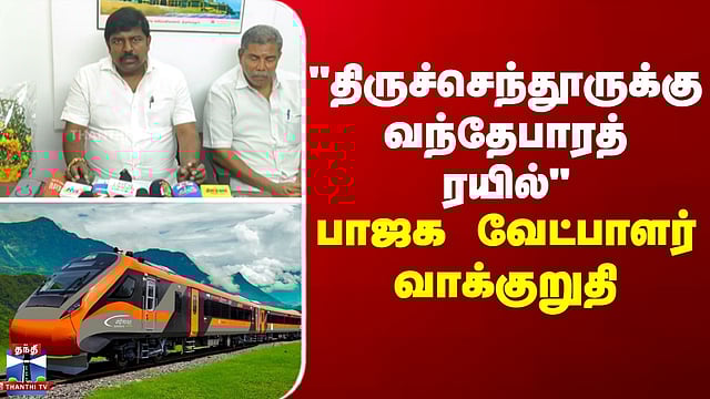 #tiruchendur | #bjp | #tnelection2026 "திருச்செந்தூருக்கு வந்தேபாரத் ரயில்" - பாஜக வேட்பாளர் வாக்குறுதி திருச்செந்தூர் தொகுதி பாஜக வேட்பாளர் கே.ஆர்.எம். ராதாகிருஷ்ணனை சந்தித்து அவரது ஆதரவாளர்கள் வாழ்த்து தெரிவித்தனர். பின்னர் செய்தியாளர்களிடம் பேசிய ராதாகிருஷ்ணன், திருச்செந்தூருக்கு வந்தே பாரத் ரயில் இயக்கவும், அம்பேத்கர் சட்டக் கல்லூரி நிறுவவும் நடவடிக்கை எடுக்கப்படும் என உறுதி அளித்தார். மேலும், உடன்குடி அனல் மின் நிலையத்தில் உள்ளூர் இளைஞர்களுக்கு வேலைவாய்ப்பு மற்றும் தாமிரபரணி சடையநேரி கால்வாயைத் தூர்வாருதல் உள்ளிட்ட பல்வேறு வளர்ச்சித் திட்டங்களைச் செயல்படுத்தப் போவதாக அவர் வாக்குறுதி அளித்தார்.