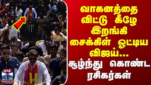 வாகனத்தை விட்டு கீழே இறங்கி சைக்கிள் ஓட்டிய விஜய் .. சூழ்ந்து கொண்ட ரசிகர்கள்