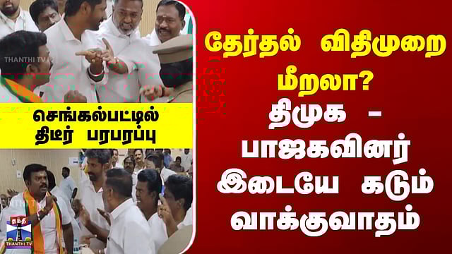 Chengalpattu | MCC | TN Election | DMK | BJP | தேர்தல் விதிமுறை மீறலா? திமுக - பாஜகவினர் இடையே கடும் வாக்குவாதம் #chengalpattu #TNElection #DMK #bjp #thanthitv செங்கல்பட்டு ஆட்சியர் அலுவலகத்தில் திமுக-பாஜகவினர் இடையே வாக்குவாதம் செங்கல்பட்டு மாவட்ட ஆட்சியர் அலுவலகத்தில் நடைபெற்ற அனைத்து கட்சி கூட்டத்தில் திமுக மற்றும் பாஜக நிர்வாகிகளிடையே கடும் வாக்குவாதம் ஏற்பட்டது. தேர்தல் நடத்தை விதிமுறைகள் அமலுக்கு வந்த பிறகு செங்கல்பட்டில் சுத்திகரிக்கப்பட்ட குடிநீர் நிலையம் திறக்கப்பட்டதாக பாஜக நிர்வாகி புகார் அளித்தார். இதனை திமுக தரப்பில் மறுத்ததால் இரு தரப்பினரும் வாக்குவாதத்தில் ஈடுபட்டனர். போலீசார் தலையிட்டு இரு தரப்பினரையும் சமாதானப்படுத்தியதையடுத்து கூட்டம் தொடர்ந்து நடைபெற்றது.
