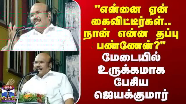 #ADMK | #Jayakumar | #Chennai | #TNPolitics | #ThanthiTV ADMK Jayakumar | "என்னை ஏன் கைவிட்டீர்கள்.. நான் என்ன தப்பு பண்ணேன்?" - மேடையில் உருக்கமாக பேசிய ஜெயக்குமார் சென்னை ராயபுரத்தில் நடந்த அதிமுக பொதுக் கூட்டத்தில் பேசிய முன்னாள் அமைச்சர் ஜெயக்குமார், "தொடர்ந்து என்னை வெற்றி பெற வைத்த ராயபுரம் மக்கள், ஏன்.. 2021ல் கைவிட்டீர்கள்... நான் என்ன தப்பு செய்தேன்.. என்று உருக்கமாக பேசினார்.