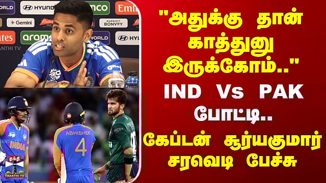 #SuryakumarYadav | #INDVsPAK | #Cricket | #SportsUpdate | #ThanthiTV Suryakumar Yadav | "அதுக்கு தான் காத்துனு இருக்கோம்.." - IND Vs PAK போட்டி.. கேப்டன் சூர்யகுமார் சரவெடி பேச்சு டி20 உலகக் கோப்பைத் தொடரில் பாகிஸ்தானுக்கு எதிரான போட்டியில் விளையாட இந்திய அணி தயாராக இருப்பதாக கேப்டன் சூர்யகுமார் யாதவ் தெரிவித்துள்ளார். வரும் சனிக்கிழமை டி20 உலகக்கோப்பை தொடங்க உள்ள நிலையில், இது தொடர்பாக செய்தியாளர்களை சந்தித்த சூர்யகுமார் யாதவ், பாகிஸ்தானுக்கு எதிரான போட்டியில் விளையாடுவதற்காக இந்திய அணி வீரர்களுக்கான விமான டிக்கெட் உறுதி செய்யப்பட்டு விட்டதாகவும், பாகிஸ்தானுக்கு எதிரான போட்டியில் விளையாடுவதற்காக இந்திய அணி இலங்கைக்கு செல்லவிருப்பதாகவும் தெரிவித்துள்ளார். அதோடு, பாகிஸ்தானுக்கு எதிராக விளையாட மாட்டோம் என்று இந்தியா கூறவில்லை என்றும் பாகிஸ்தானுக்கு எதிராக விளையாடும் வாய்ப்பு கிடைத்தால் இந்திய அணி விளையாடும் என்றும் தெரிவித்துள்ளார்.