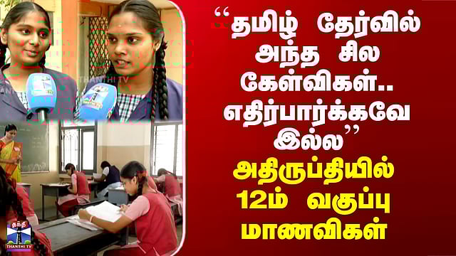 தமிழ் தேர்வு குறித்து 12ஆம் வகுப்பு மாணவிகள் கருத்து பன்னிரண்டாம் வகுப்பு பொதுத்தேர்வு நேற்று தொடங்கிய நிலையில், முதல் நாளாக மொழிப்பாடத் தேர்வு நடைபெற்றது. பெரும்பாலான மாணவர்கள் தமிழ் தேர்வை எழுதினர். சென்னை எழும்பூர் அரசு மகளிர் மேல்நிலைப் பள்ளியில் தேர்வு முடித்து வெளியே வந்த மாணவிகள், வினாத்தாளில் ஒரு மதிப்பெண் பகுதி சற்று கடினமாக இருந்ததாகவும், மற்ற கேள்விகள் எளிதாக இருந்ததாக தெரிவித்தனர்.