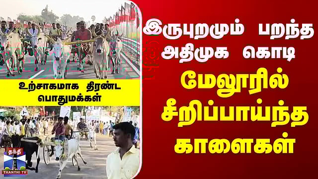 ADMK | Rekla Race | அதிமுக சார்பில் மேலூரில் நடைபெற்ற மாட்டுவண்டி பந்தயம் - சீறிப்பாய்ந்த காளைகள் #admk #reklarace #thanthitv இரட்டை மாட்டுவண்டி பந்தயம் – உற்சாகமாக கண்டு ரசித்த பொதுமக்கள் மதுரை மாவட்டம் மேலூர் அருகே வெள்ளலூரில் எம்ஜிஆர், ஜெயலலிதா பிறந்த நாளை முன்னிட்டு மேலூர் தெற்கு ஒன்றிய அதிமுக சார்பில் இரட்டை மாட்டுவண்டி பந்தயம் நடைபெற்றது. போட்டியை மேலூர் எம்எல்ஏ பெரியபுள்ளான் மற்றும் முன்னாள் எம்எல்ஏ தமிழரசன் கொடி அசைத்து தொடங்கி வைத்தனர். இரண்டு பிரிவுகளாக நடைபெற்ற போட்டியில் மொத்தம் 35 ஜோடி மாடுகள் பங்கேற்று சீறிப்பாய்ந்து ஓடியது. சாலையின் இருபுறமும் நின்ற பொதுமக்கள் உற்சாகமாக கண்டு ரசித்தனர். வெற்றி பெற்ற அணிகளுக்கு பரிசுகள் வழங்கப்பட்டன. காவல்துறையினர் பாதுகாப்பு பணியில் ஈடுபட்டனர்.