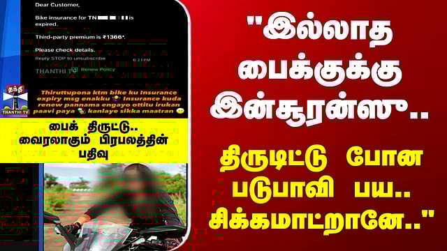 பிரபல தொகுப்பாளினி மணிமேகலை, தான் ஆசையா வாங்கித் திருடு போன பைக் பத்தி போட்டிருக்கிற இன்ஸ்டாகிராம் பதிவு இப்போ சோஷியல் மீடியால செம வைரலாகிட்டு வருது... மணிமேகலை - ஹுசைன் ஜோடியோட பைக் கடந்த 2022ல திருடு போச்சு... இது சம்பந்தமா அவங்க போலீஸ்ல புகாரும் குடுத்திருந்தாங்க... இந்த நிலையில, மணிமேகலையோட போனுக்கு அந்தப் பைக்கோட இன்சூரன்ஸ் முடியப்போகுதுன்னு ஒரு மெசேஜ் வந்திருக்கு... இதைப் பார்த்த மணிமேகலை, "திருட்டுப்போன என் பைக்குக்கு இன்சூரன்ஸ் எக்ஸ்பைரி மெசேஜ் வருது... இன்சூரன்ஸ் கூட கட்டாம எங்கேயோ வண்டிய ஓட்டிட்டு இருக்காங்க" அப்படின்னு அவங்களுக்கே உரிய பாணியில கலாய்த்துப் பதிவு போட்டிருக்காங்க.... வண்டியப் பத்தி எந்தத் தகவலும் இல்லனாலும், வந்த மெசேஜை வைச்சு மணிமேகலை செஞ்ச இந்த நக்கல் கமெண்ட் இப்போ நெட்டிசன்களையும் சிரிக்க வைச்சிருக்கு...