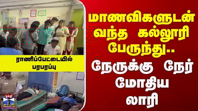 மாணவிகளுடன் வந்த கல்லூரி பேருந்து.. நேருக்கு நேர் மோதிய லாரி ராணிப்பேட்டை - தனியார் கல்லூரி பேருந்து மீது லாரி மோதி விபத்து ராணிப்பேட்டை மாவட்டம் சோளிங்கர் அருகே கல்லூரி மாணவிகளை ஏற்றி வந்த பஸ் கண்டெய்னர் லாரியுடன் நேருக்கு நேர் மோதிய விபத்தில் 20 மாணவிகள் லேசான காயங்களுடன் அதிர்ஷ்டவசமாக உயிர்தப்பினர்