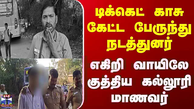 டிக்கெட் காசு கேட்ட பேருந்து நடத்துனர்.. எகிறி வாயிலே குத்திய கல்லூரி மாணவர் #busconductor #bus #police #college #student #thanthitv டிக்கெட் கேட்ட அரசுப்பேருந்து நடத்துனரை தாக்கிய கல்லூரி மாணவன் ஓசூர் அருகே, அரசுப் பேருந்தில் டிக்கெட் கேட்ட நடத்துனரை கல்லூரி மாணவன் தாக்கிய சம்பவம் பரபரப்பை ஏற்படுத்தியது. இதையடுத்து, காவல் நிலையத்திற்கு அரசு பேருந்தை ஓட்டிச்சென்ற ஓட்டுநர் மற்றும் நடத்துனர், அந்த மாணவனை போலீசாரிடம் ஒப்படைத்தனர்.