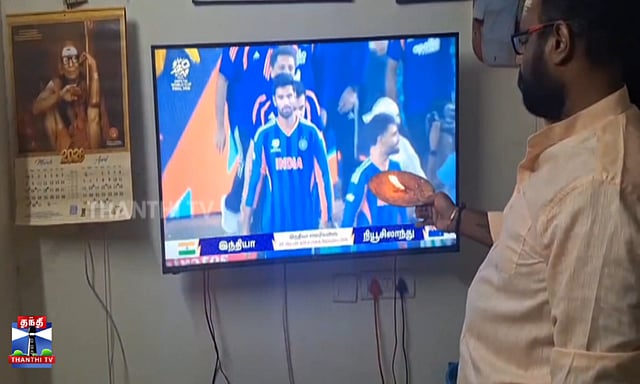டி20 உலகக்கோப்பையை இந்தியா வென்றதை அடுத்து, ராமேஸ்வரத்தை சேர்ந்த ரசிகர் ஒருவர் டிவிக்கு முன்பாக ஆரத்தி எடுத்தார். இந்த வீடியோ இணையத்தில் வைரலாகி வருகிறது.