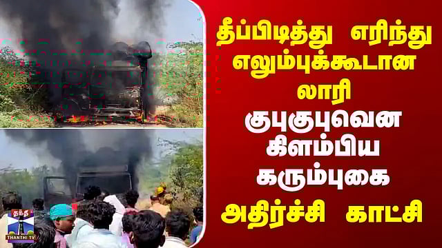 திடீரென பற்றி எரிந்து எலும்புக்கூடான லாரி..குபுகுபுவென கிளம்பிய கரும்புகை