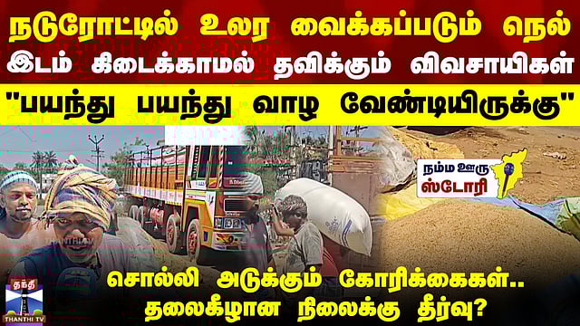 நடுரோட்டில் கொட்டி கிடக்கும் நெல்.. இடம் கிடைக்காமல் தவிக்கும் விவசாயிகள்.. "பயந்து பயந்து வாழ வேண்டியிருக்கு" சொல்லி அடுக்கும் கோரிக்கைகள்.. தலைகீழான நிலைக்கு தீர்வு? #farmer #agriculture #Road #nammaoorustory #thanthitv