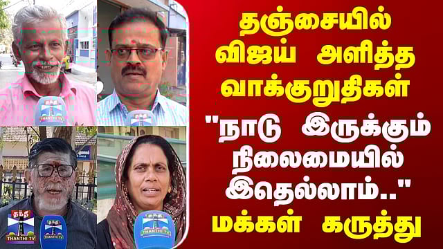 #ThanthiStreetInterviews | #Thanjavur | #TVKVijay | #ThanthiTV Street Interview | தஞ்சையில் விஜய் அளித்த வாக்குறுதிகள் - "நாடு இருக்கும் நிலைமையில் இதெல்லாம் நடக்குமானு சந்தேகமா இருக்கு" - மக்கள் கருத்து தஞ்சாவூரில் தவெக நிர்வாகிகள் சந்திப்பில் பங்கேற்ற அக்கட்சியின் தலைவர் விஜய், விவசாயம் சார்ந்த பல்வேறு தேர்தல் வாக்குறுதிகளை அளித்தார், அது குறித்து மக்கள் குரல் பகுதியில் எழுப்பப்பட்ட கேள்விகளுக்கு, பல்வேறு பகுதிகளை சேர்ந்த மக்கள் தெரிவித்த கருத்துக்களைப் பார்க்கலாம்...