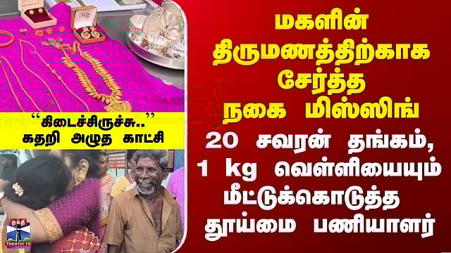 Tiruvarur | Gold Missing | மகளின் திருமணத்திற்காக சேர்த்த நகை மிஸ்ஸிங் | மீட்டுக்கொடுத்த தூய்மை பணியாளர் #tiruvarur #goldmissing #goldjewels #sanitaryworker #thanthitv கீழே கிடந்த 20 சவரன் நகை - மீட்டுக் கொடுத்த தூய்மை பணியாளர் 20 சவரன் நகை, ஒரு கிலோ வெள்ளி பொருட்களை தொலைத்த குடும்பம் திருவாரூர் மாவட்டம் ஆலத்தம்பாடியில், 20 சவரன் நகைகள் மற்றும் ஒரு கிலோ வெள்ளிப்பொருட்களுடன் கிடந்த பையை மீட்டு, போலீசாரிடம் ஒப்படைத்த தூய்மை பணியாளருக்கு பாராட்டு குவிகிறது... தொலைந்து போன நகைகள் கிடைத்த உடன், அதன் உரிமையாளர் கண்ணீர் விட்டு கதறி அழுத காட்சியும் வெளியாகி இருக்கிறது
