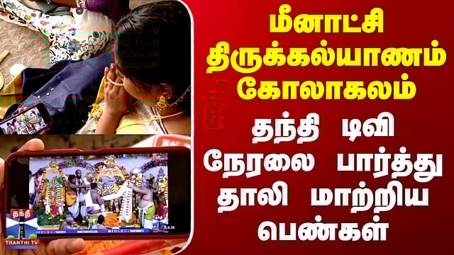 மீனாட்சி திருக்கல்யாணம் - தந்தி டிவி நேரலையை பார்த்து மாங்கல்யம் மாற்றிய பெண்கள் உலகப்புகழ் பெற்ற மதுரை மீனாட்சி அம்மன் கோவில் சித்திரைத் திருவிழாவின் சிகர நிகழ்வான திருக்கல்யாண வைபவம் பக்திப் பெருக்குடன் நடைபெற்றது. லட்சக்கணக்கான பக்தர்கள் மதுரையில் குவிந்த நிலையில், கோவிலுக்குள் செல்ல இயலாத ஆயிரக்கணக்கான பெண்கள் வெளியே காத்திருந்தனர்....