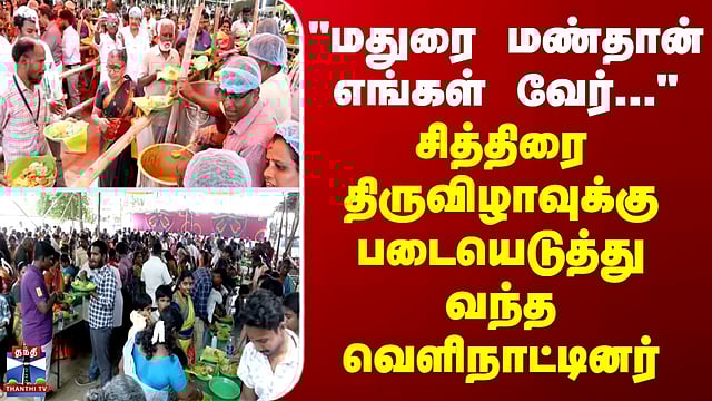 "மதுரை மண்தான் எங்கள் வேர்..." - சித்திரை திருவிழாவுக்கு படையெடுத்து வந்த வெளிநாட்டினர் மீனாட்சி திருக்கல்யாண விருந்தில் பரிமாறும் மலேசிய பக்தர்கள் மதுரை சேதுபதி பள்ளியில் மீனாட்சி திருக்கல்யாணத்தை ஒட்டி லட்சக்கணக்கான பக்தர்களுக்கு திருக்கல்யாண விருந்து அளிக்கப்பட்டது. ஆண்டுதோறும் இந்த விருந்தில் மலேசியாவை சேர்ந்த தன்னார்வலர்கள் தொண்டாற்றி வருகின்றனர். அவர்கள் தந்திடிவிக்கு அளித்த பேட்டியை காணலாம்....