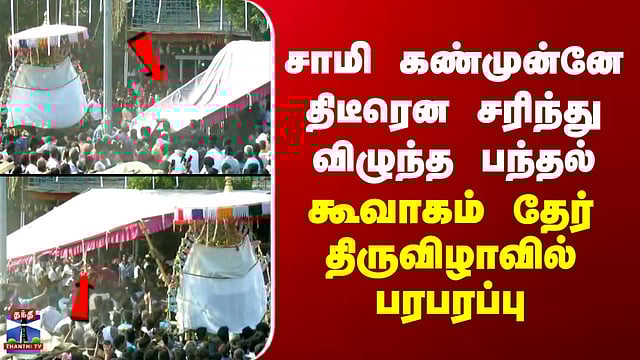 சாமி கண்முன்னே திடீரென சரிந்து விழுந்த பந்தல்.. கூவாகம் தேர் திருவிழாவில் பரபரப்பு #KoovagamChariot #therthalthiruvizha #Koovagam #thanthitv புகழ்பெற்ற கூவாகம் தேர் திருவிழா சற்று நேரத்தில் தொடங்க உள்ள நிலையில் விழாவிற்காக அமைக்கப்பட்டு இருந்த பந்தல் சரிந்ததால் சலசலப்பு ஏற்பட்டது. இது தொடர்பான காட்சிகளை காண்போம்... தேர் திருவிழாவிற்கு வரும் பக்தர்கள் நிற்பதற்காக பந்தல் அமைக்கப்பட்டு இருந்தது. தேர் திருவிழாவையொட்டி சுவாமி புறப்பாடு நடைபெற்றது. அப்போது சுவஅமியை தூக்கி வந்தவர்கள் கூட்ட நெரிசல் காரணமாக பந்தலில் எதிர்பாராத விதமாக மோதினர். இதனால் பந்தலின் ஒரு பகுதி சரிந்தது... தேர் திருவிழாவில் பந்தல் சரிந்ததால் அங்கு சற்று சலசலப்பு ஏற்பட்ட நிலையில் பந்தலை சரிசெய்யும் பணி நடைபெற்றது,