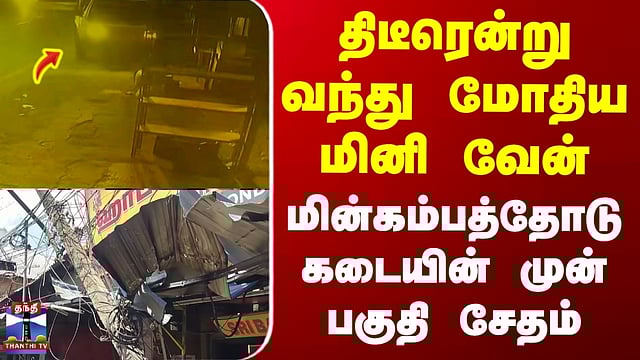 திடீரென்று வந்து மோதிய மினி வேன்.. மின்கம்பத்தோடு கடையின் முன் பகுதி சேதம்